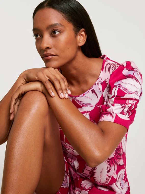 Verspielte Details und der opulente Blumenprint bringen den Kurz-Pyjama aus der BLOOMING NIGHTS Serie von CALIDA zum Leuchten. Weiche Supima®, Baumwolle mit swiss+cotton-Gütesiegel umschmeichelt die weibliche Silhouette angenehm und verzaubert mit tollem Tragegefühl. Die leichten Puffärmel sorgen neben dem großflächigen Papageientulpenprint für einen weiteren Hingucker.
