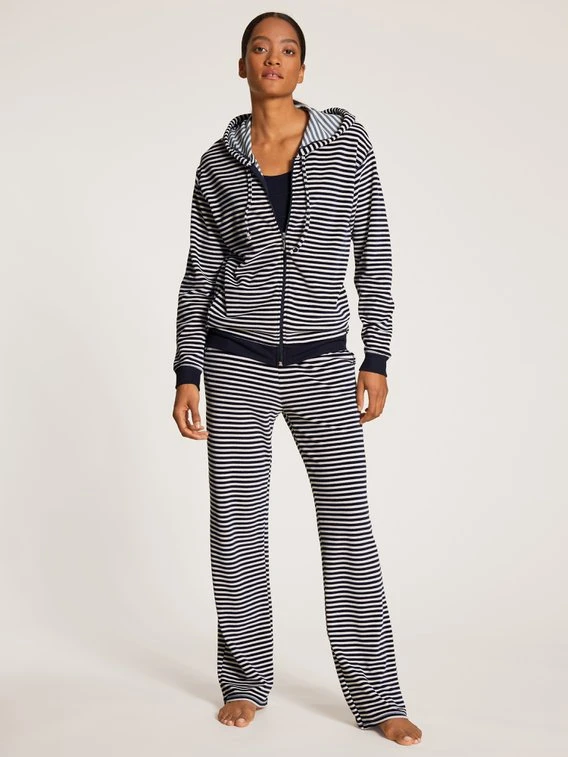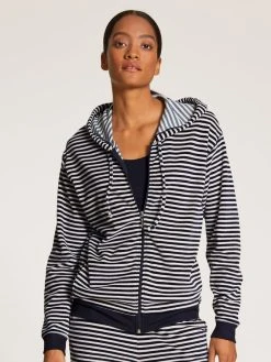 Auf jede gute Idee folgen meist noch bessere: Die FAVOURITES MARINE Kapuzenjacke von CALIDA spinnt die Erfolgsgeschichte des Hoodies auf sommerliche Weise weiter. Statt mit schwerem Sweat glänzt dieser Streifenliebling mit angenehm leichter Velours-Baumwolle, der Schnitt ist lässig und doch feminin. Schön zum Kombinieren und Layern, noch schöner zu tragen!