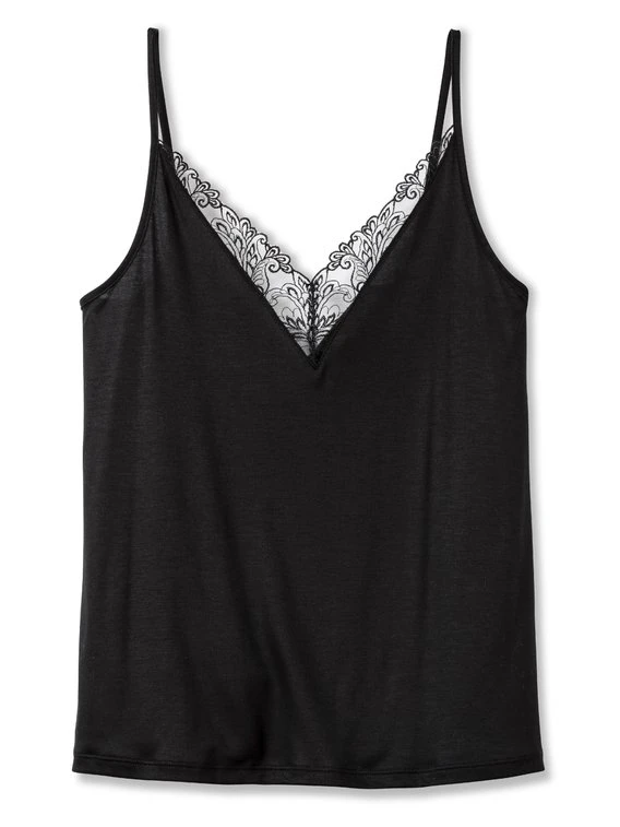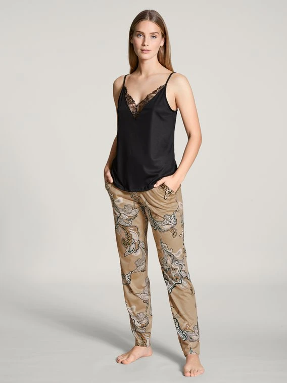 Spitzen-Spaghetti-Top mit Seide aus der Serie FAVOURITES SEDUCTION von CALIDA. Das edle Shirt ohne Arm wurde am Dekolleté mit hochwertiger, grafischer Stickerei verziert. Ein absolut modischer Look entsteht in Kombination mit dem Kimono und der Palazzo-Hose.