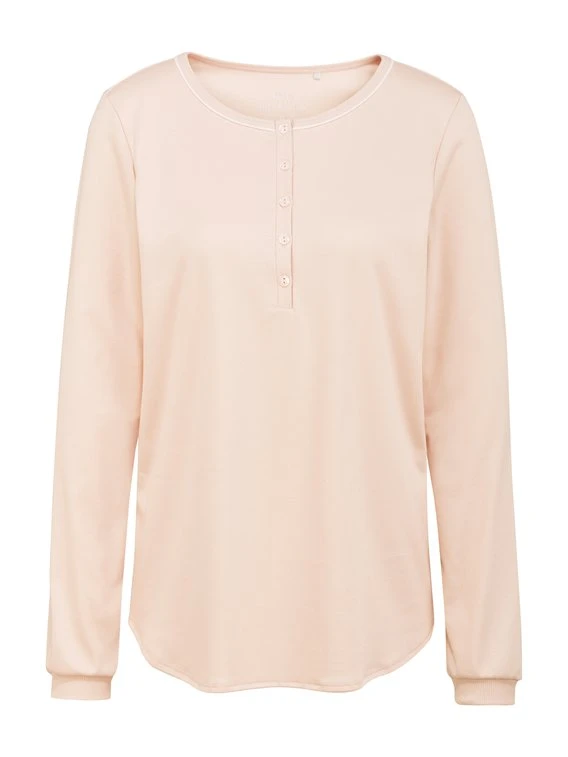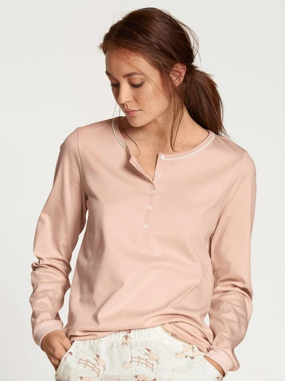 Müsste man das FAVOURITES SHEEP Langarm-Top von CALIDA in nur einem Wort beschreiben, wäre „hauchzart“ die treffendste Wahl. Das Lounge-Basic im mädchenhaften Ton bringt mit romantischen Zierdetails und dezenter Knopfleiste Abwechslung in die Homewear-Kollektion. Auch beweist es sich im Alltag als ausgesprochen pflegeleicht. Obwohl es so luftig wirkt, verbreitet es mit einer schweren Baumwollqualität wohlige Wärme an kühleren Tagen.