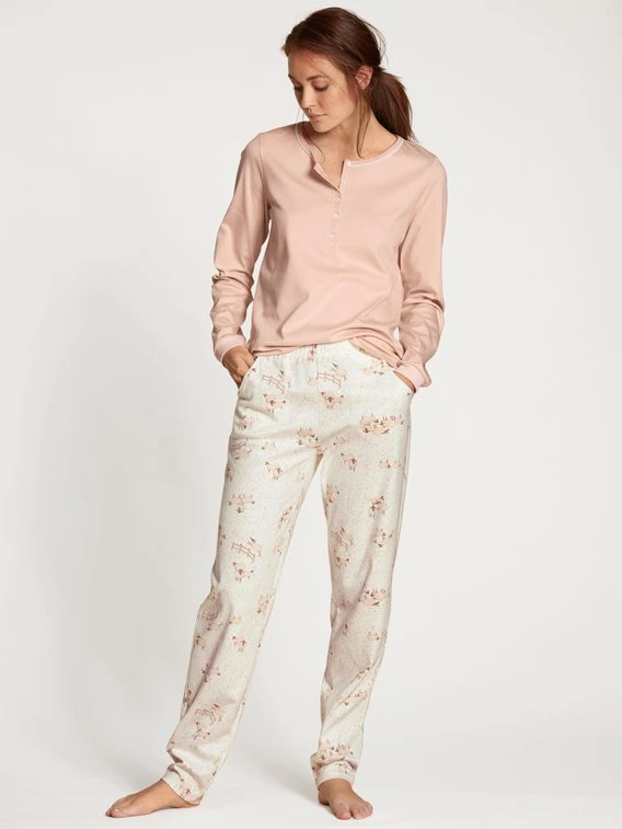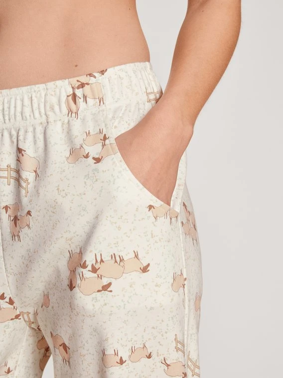 Schafe zählen zum Einschlafen ist der älteste Trick der Welt – und die Inspiration für die FAVOURITES SHEEP Kollektion von CALIDA. Auf der Pyjamahose mit Elastikbund und geradem Bein tummeln sich die Einschlafhelfer in einem bezaubernden Design. Die schwere Baumwollqualität soll an ihr weiches Wollfell erinnern. Also, los geht’s: Eins, zwei, drei …