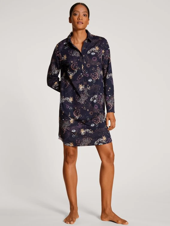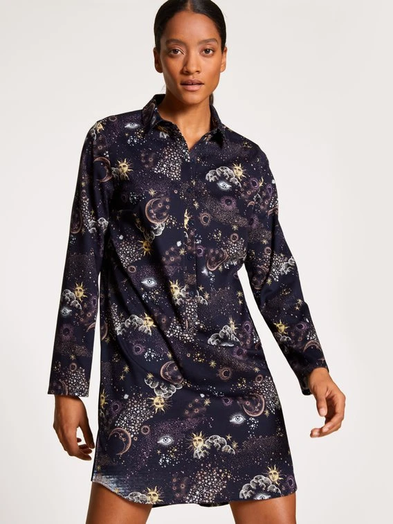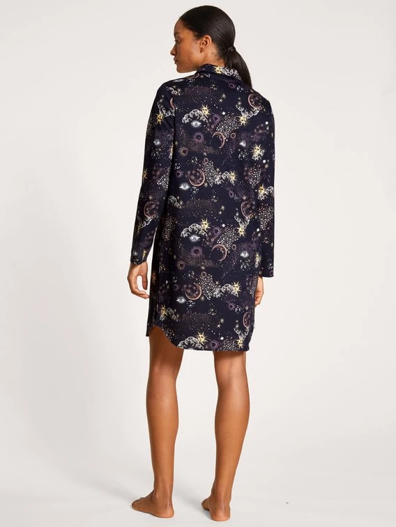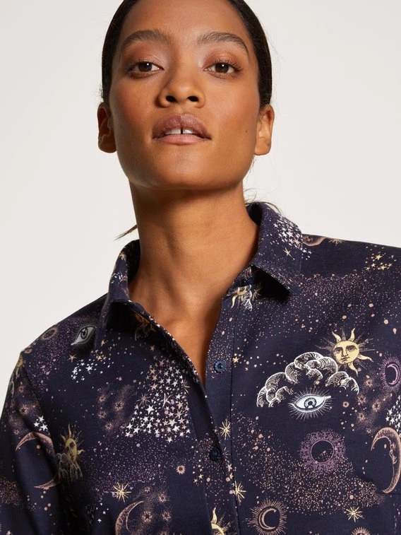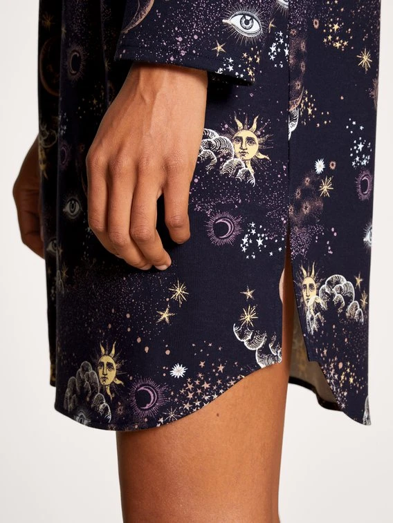 Wenn wir nach den Sternen greifen, machen wir es gleich richtig! Auf dem FAVOURITES UNIVERSE Loungedress von CALIDA zeigen sich Sonne, Mond und Sterne als beruhigend-ätherischer Astro-Print, der den Schlaf gekonnt einläutet. Der bequeme Hemdschnitt mit durchgehender Knopfleiste und abgerundetem Saum mixt Style und Komfort – natürlich auf wunderbar entspannte und entspannende Weise.