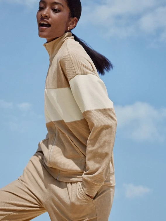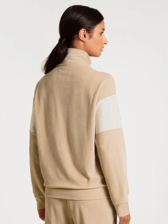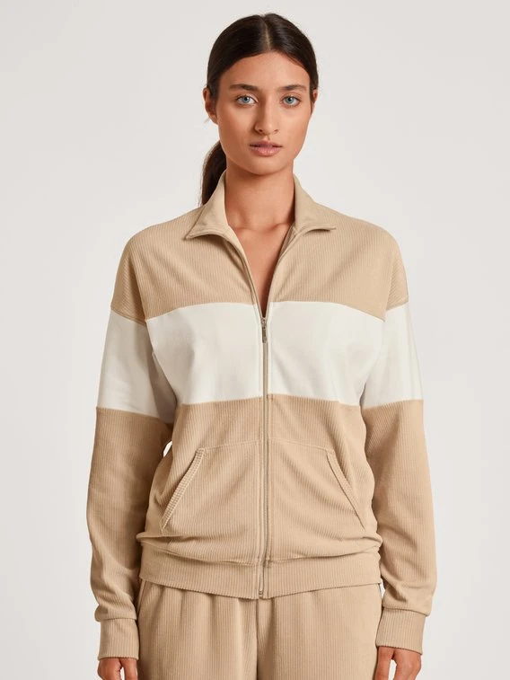 CALIDA erweitert ihre Loungewear-Auswahl mit der Jacke aus der LOUNGE DESERT Serie um ein weiteres Piece, welches in jeden stilbewussten Kleiderschrank gehört. Neben dem weichen Nickistoff, welcher 2023 ein Revival erlebt, sorgt der farblich abgesetzte Querstreifen im Retrodesign für den Hingucker.