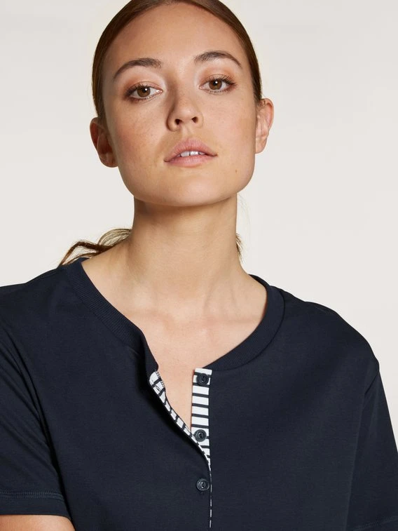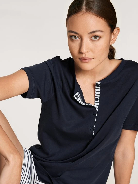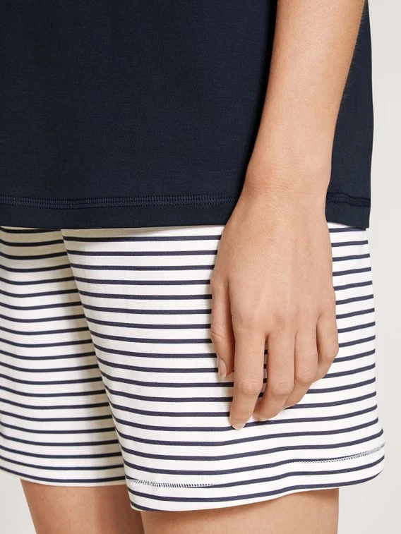 MIDSUMMER DREAMS sollen vor allem eines sein: ungezwungen erholsam und erfrischend – egal, was das Thermometer sagt. Der Kurz-Pyjama mit V-Shirt ist dafür wie gemacht. Bei seinem maritimen Look kann man die Meeresbrise fast spüren, der luftige Schnitt lässt Haut und Körper atmen. Gleichzeitig ist die Baumwolle gegen Schwitzattacken im Einsatz und macht dieses sommerliche CALIDA Modell schon fast zur tragbaren Klimaanlage.