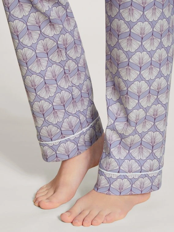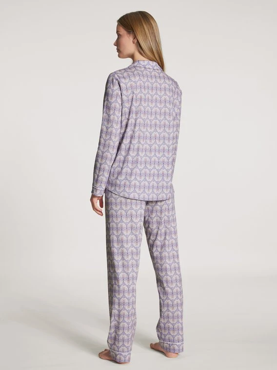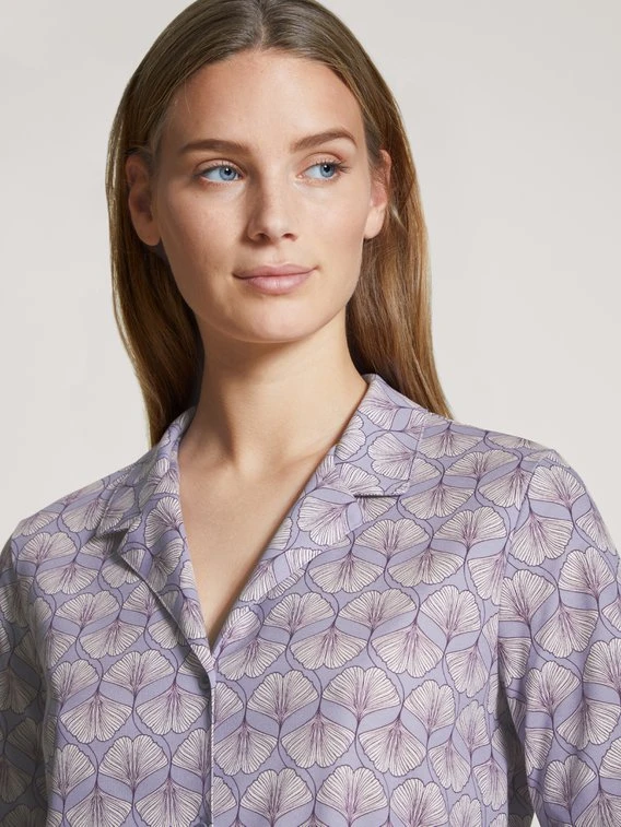 Durchgeknöpfter Damenpyjama aus der CALIDA-Serie MIDSUMMER DREAMS aus Baumwoll-Interlock. Die Knopfleiste und der Reverskragen sorgen für einen komfortablen Style im angesagten Boyfriend-Look. Der Schlafanzug ist klassisch geschnitten und ist mit einem Allover-Muster geschmückt.