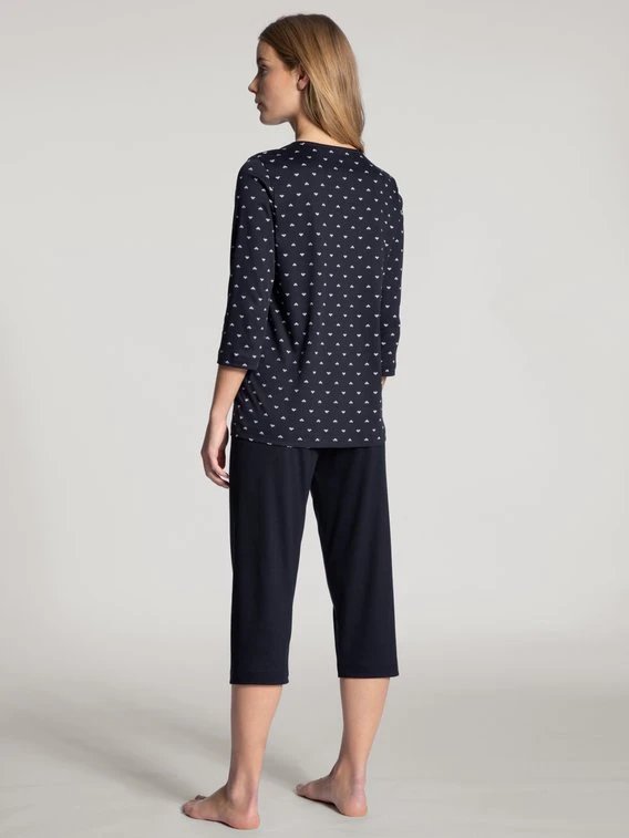 Durch hochwertige Supima®-Baumwolle in wärmender Interlock-Bindung wird Ihre Haut sanft umhüllt und verwöhnt Sie so mit erholsamem Schlaf. Die klassische Farbgebung des Capri-Pyjamas aus der Serie NIGHT LOVERS von CALIDA rundet den Look ab.
