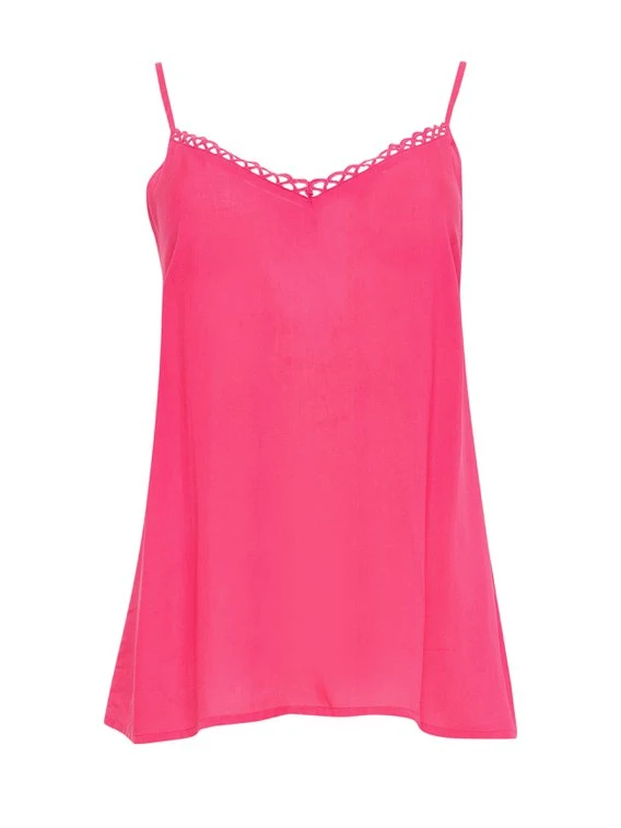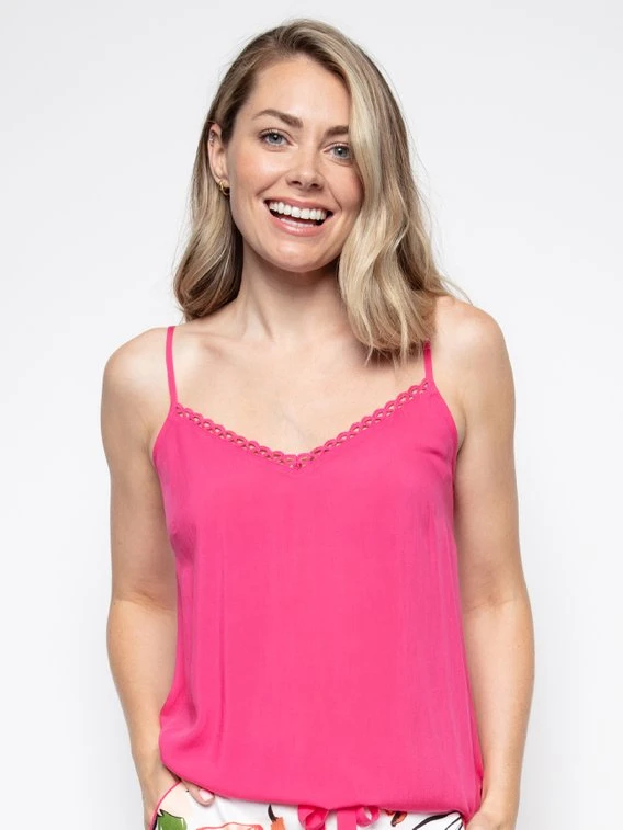 Das Cami-Top aus der Serie “Vanessa” von CYBERJAMMIES, begeistert im sommerlichen Design und tollem Tragekomfort. Gefertigt aus 100% Modal, liegt das Top angenehm weich und leicht auf der Haut. Die Mäusezahnspitze am V-Ausschnitt rundet das Design im sommerlich strahlendem Pink perfekt ab.