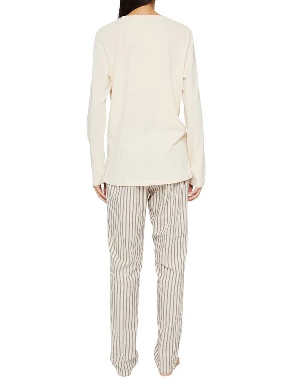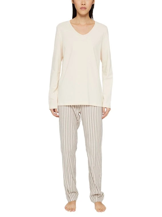 Weiche Baumwolle sorgt bei diesem Schlafanzug von ESPRIT für besten Schlafkomfort. Das Modell besteht aus einem locker geschnittenen Oberteil mit V-Ausschnitt, das unifarben designt wurde. Die Hose setzt mit ihrem Streifendesign einen schönen Kontrast. Zum Wohlfühlen!