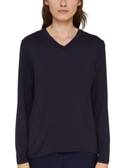 Klassisches Langarm-Shirt für Damen von ESPRIT. Das Oberteil besitzt einen hohen Viskose-Anteil, weshalb es leicht und anschmiegsam ist. Die unifarbene Optik wird durch den doppelt besetzten V-Ausschnitt aufgewertet.