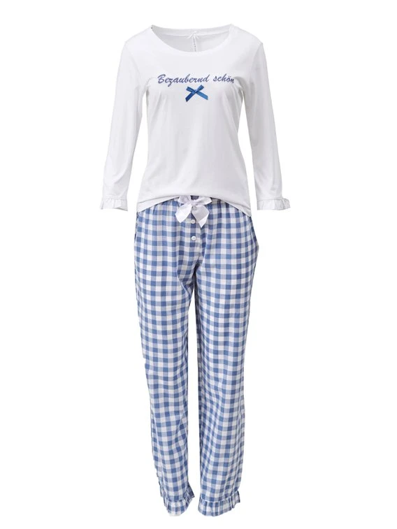 Der Pyjama aus der Serie “Bezaubernd schön” von LOUIS & LOUISA ist der perfekte Basic Pyjama für den Alltag. Der Look wird durch Satinschleifchen am Shirt und den Pants im Karomuster perfekt ergänzt. 100% Baumwolle liegt angenehm weich und leicht auf der Haut und verzaubert mit tollem Tragegefühl.
