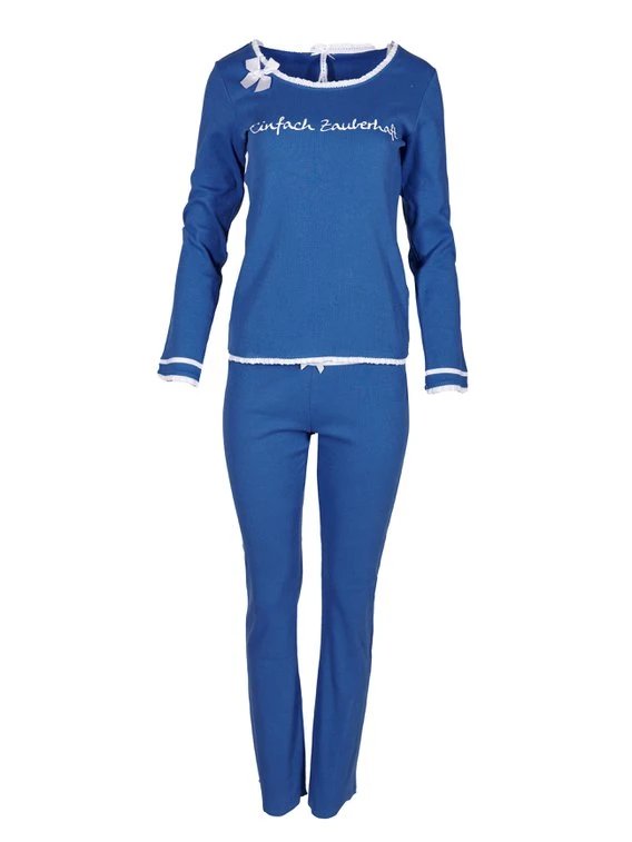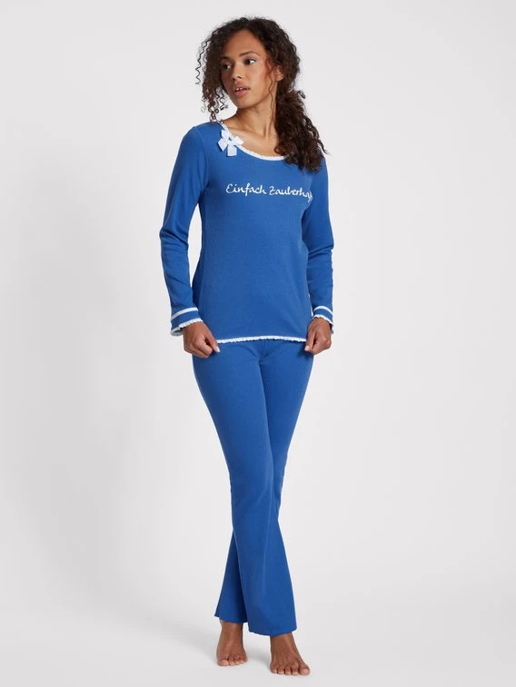 Für winterliche Romantik sorgt der gerippte Pyjama aus der “Einfach Zauberhaft” Serie von LOUIS & LOUISA. Das Set besteht aus einem Langarmshirt mit Rüschenabschlüssen und Schleifendetail und einer langen Pant mit Schneeflockenallover. Der Stoff aus Baumwolle mit geringem Elasthan Anteil ist besonders angenehm zu tragen und sorgt somit für einen erholsamen Schlaf.