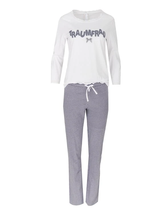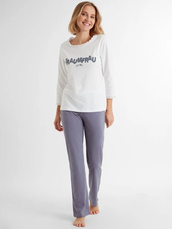 Bezaubernder Langarm Pyjama von LOUIS & LOUISA aus der Serie “Traumfrau”. Die 100% Baumwolle bietet bestmöglichen Komfort für einen angenehmen Schlaf. Der Look wird durch das Satinschleifchen auf der Brust und den Pünktchen-Pants versüßt.