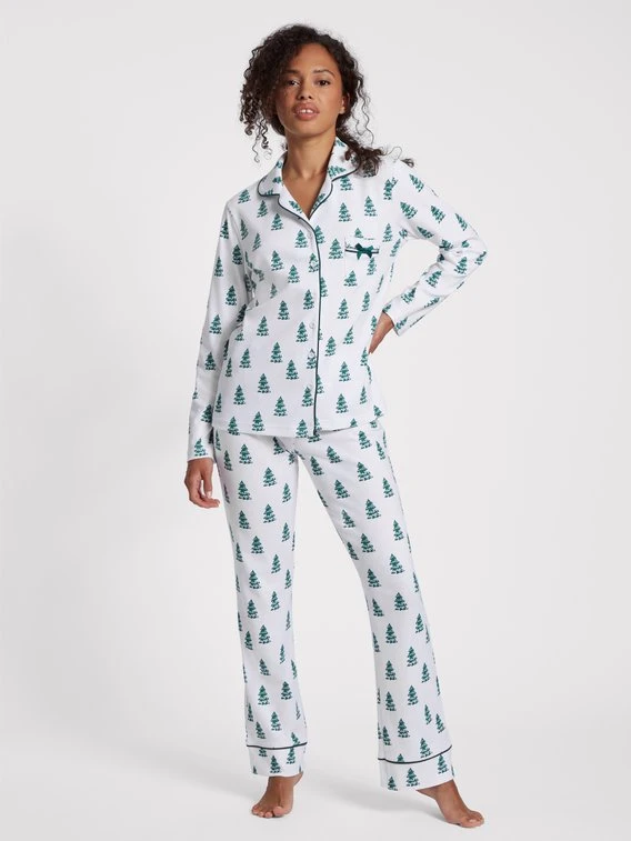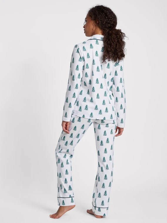 LOUIS & LOUISA präsentiert einen Langarm-Pyjama aus der “Winterwunderland” Serie. 100% Baumwolle liegt angenehm weich auf der Haut und sorgt für wahre Wohlfühlmomente. Das süße Satinschleifchen auf der Brust und die Paspelierung an Reverskragen und Beinabschlüssen ergänzen den Allover Tannen Look des Sets perfekt.
