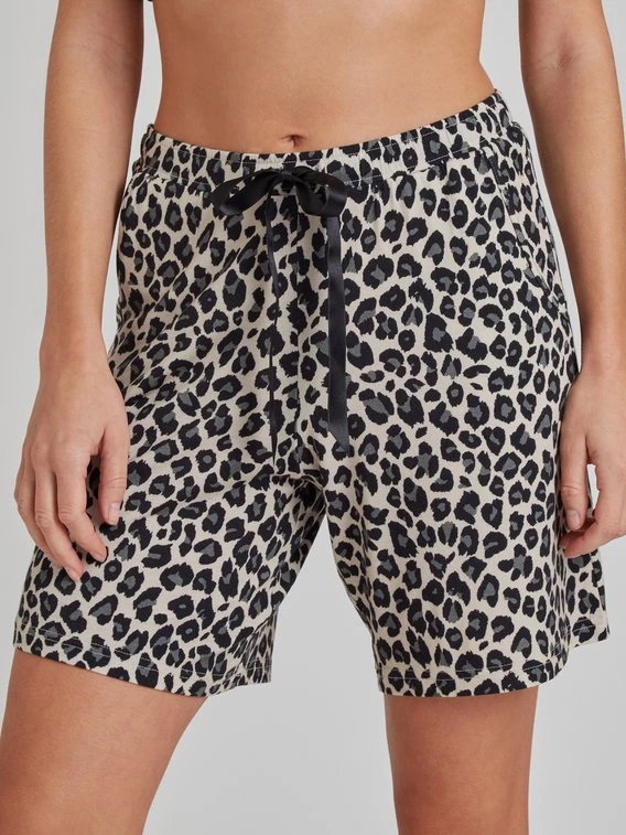 NINA VON C. präsentiert aus der “Loungewear Easy”-Kollektion eine modische Bermuda-Shorts. Das leichte Material aus einer Modal-Mischung eignet sich ideal für warme Sommernächte. Das animalische Leoparden-Muster schafft einen einzigartigen Look und wird mit einer Satin-Schleife am Bund abgerundet.