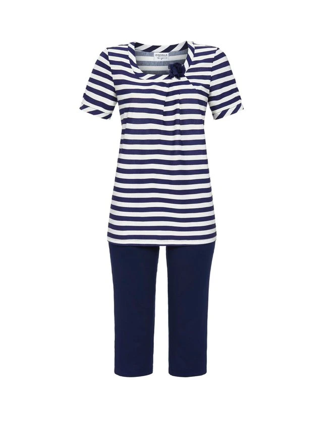 Der Pyjama mit Caprihose aus der “Lingerie”-Serie im Stil der 50er Jahre von RINGELLA ist ein richtiger Eyechatcher. Auch hier wurde auf bewährte Single Jersey-Qualität gesetzt. Stilvolle Elemente wie die Faltenlegung am Ausschnitt sowie die abnehmbare Applikation in Form einer Blüte ergänzen das Oberteil. Die unifarbene Hose rundet den lässigen Look ab.