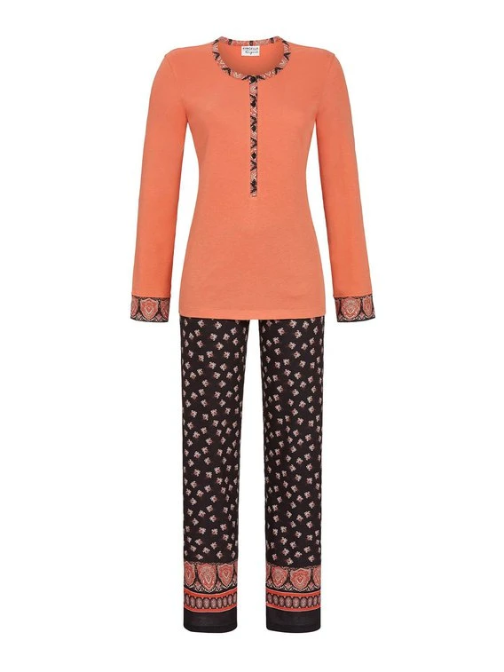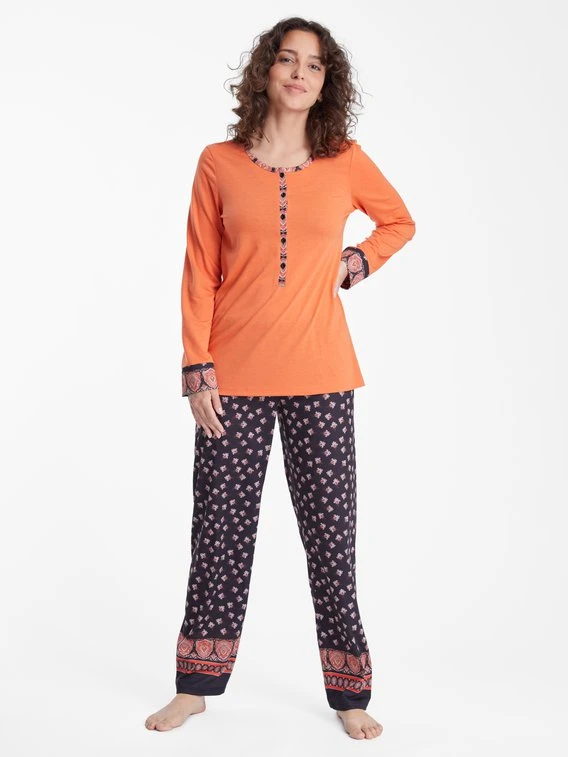 Tragekomfort und Design – damit punktet der Pyjama von RINGELLA aus der Serie “Lingerie”. Der Damen-Schlafanzug besteht aus einer hochwertigen Baumwoll-Modal-Mischung, die sich angenehm auf die Haut legt. Das Langarmshirt greift an den Ärmelabschlüssen und dem modischen Serafino-Ausschnitt gekonnt das trendige Design auf. Die Hose mit einem romantischen Allover-Print verleiht dem Schlafanzug einen gewissen Retro-Charme und rundet den femininen Look perfekt ab.
