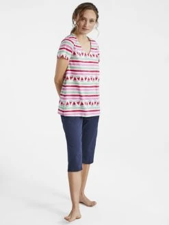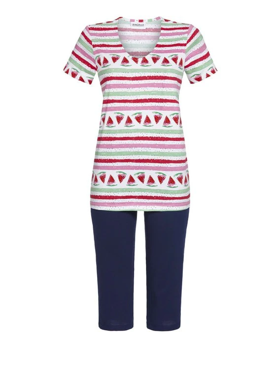 RINGELLA greift bei diesem Capri-Pyjama aus der Serie “Women” das Motiv der Wassermelone auf. Ein rot-grün gestreiftes Oberteil wird durch Wassermelonen-Prints ergänzt. Die schlichte, unifarbene Caprihose lenkt den Fokus noch mehr auf das außergewöhnliche Melonen-Muster. Der Pyjama aus reiner Baumwolle verspricht besten Tragekomfort beim Loungen und in der Nacht.