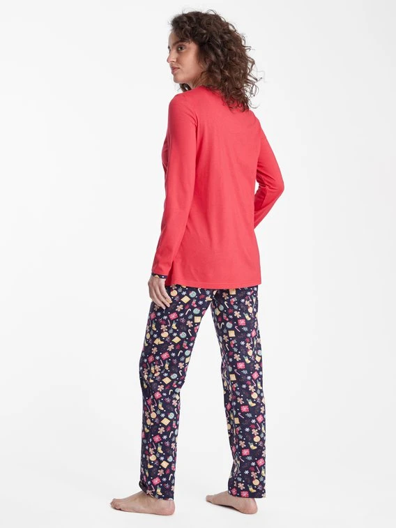 Der winterliche Pyjama aus der „Women“ Serie von RINGELLA sorgt durch die weiche, reine Baumwolle für kuschelige Stunden. Die Hose ist über und über mit Weihnachtsschmuck bedruckt und wird mit einem unifarbenen Longsleeve kombiniert. Der kräftige, warme Farbton und die Weihnachtsbotschaft auf der Brust runden das süße Design des Schlafanzugs perfekt ab.