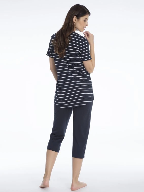 Höchster Komfort kombiniert mit zeitlosem Design, so präsentiert SCHIESSER den Pyjama aus der „Basic Night“ Serie. Der Capri-Pyjama überzeugt nicht nur durch sein angenehmes Single Jersey Material, sondern auch durch seine zeitlose Kombination aus gestreiftem Oberteil und einfarbiger Hose. Ein optisches Highlight setzt außerdem der Kordelzug, der nicht nur eine ideale Passform gewährleistet, sondern auch farblich perfekt abgestimmt ist. Dank der kurzen Ärmel des Shirts und der ¾-Länge der Hose eignet sich der Pyjama sowohl bei warmem als auch bei kühlerem Wetter.