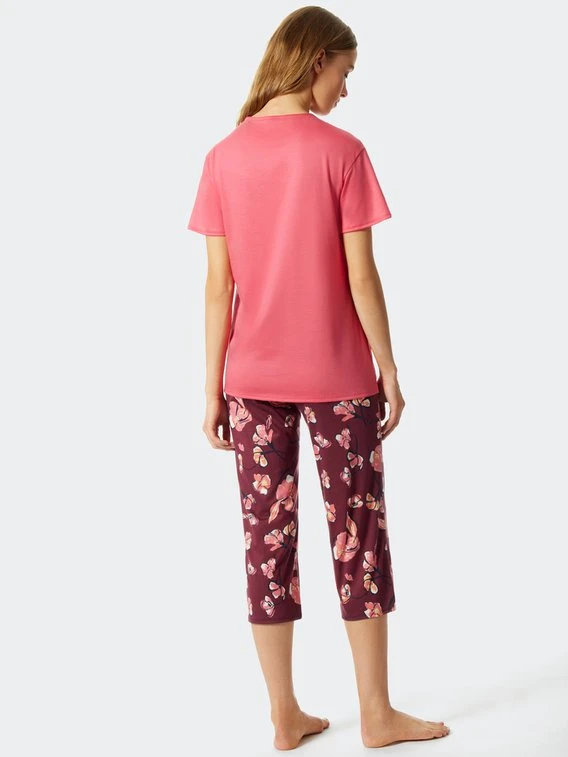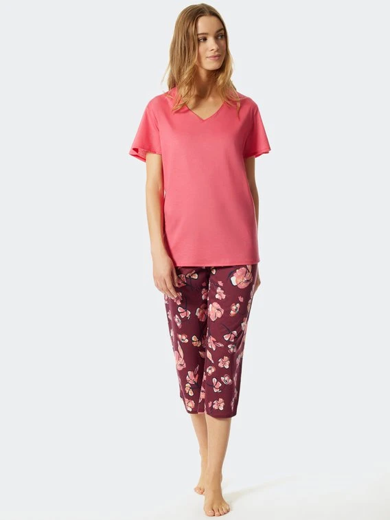 Mit dem Seriennamen „Modern Floral“ von SCHIESSER wird bereits auf das moderne Design dieses Damen-Pyjamas hingedeutet. Das Modell besteht aus einem Kurzarmshirt mit V-Ausschnitt, das locker geschnitten ist. Die floral gemusterte Hose setzt zum unifarbenen Oberteil einen starken Kontrast. Hochwertige Single-Jersey Qualität sorgt für ein angenehmes Hautgefühl.