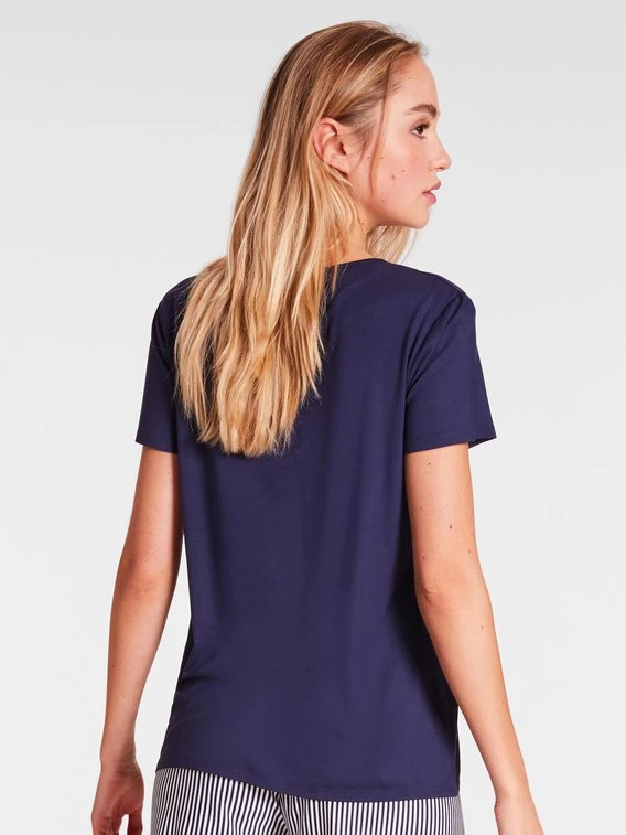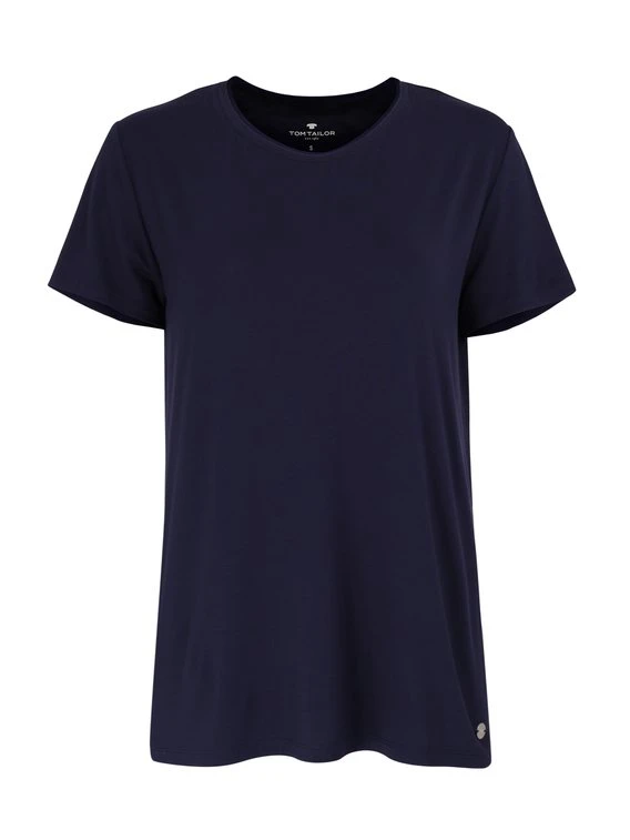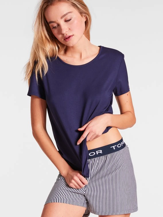 Hochwertig verarbeitetes Kurzarm-Shirt aus der “Loungewear” Kollektion von TOM TAILOR. Das Oberteil mit breitem Rundhalsausschnitt ist aus einem feinen Viskose-Elasthan Mix in Single Jersey-Qualität. Die gedeckte Farbgebung ermöglicht viele Kombinationsmöglichkeiten, sowohl für klassische als auch moderne Pyjama-Looks.